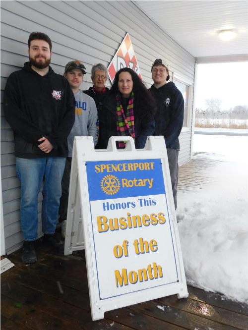 Pictured with DJ’s owner Karen are Rotarian Anne Forberg and longtime, dedicated team members Andrew, Hunter, and Matt. Thank you to DJ’s Pizza for your continued commitment to excellent food, outstanding service, and our community. Congratulations on this well-deserved recognition from Spencerport Rotary!